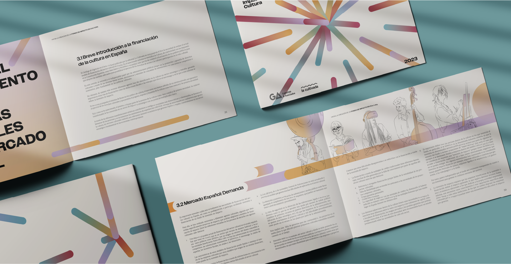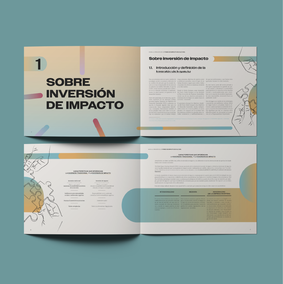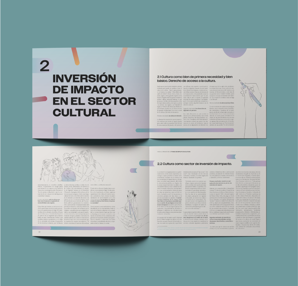 La editorial la cultivada me encargó la maquetación del informe Hacia la creación de un fondo de impacto en cultura dónde se explora nuevas formas de financiación para el sector cultural. La maquetación y la ilustración buscan transformar la información en una experiencia visual clara y atractiva, combinando diseño editorial con una identidad gráfica que refuerza el mensaje.