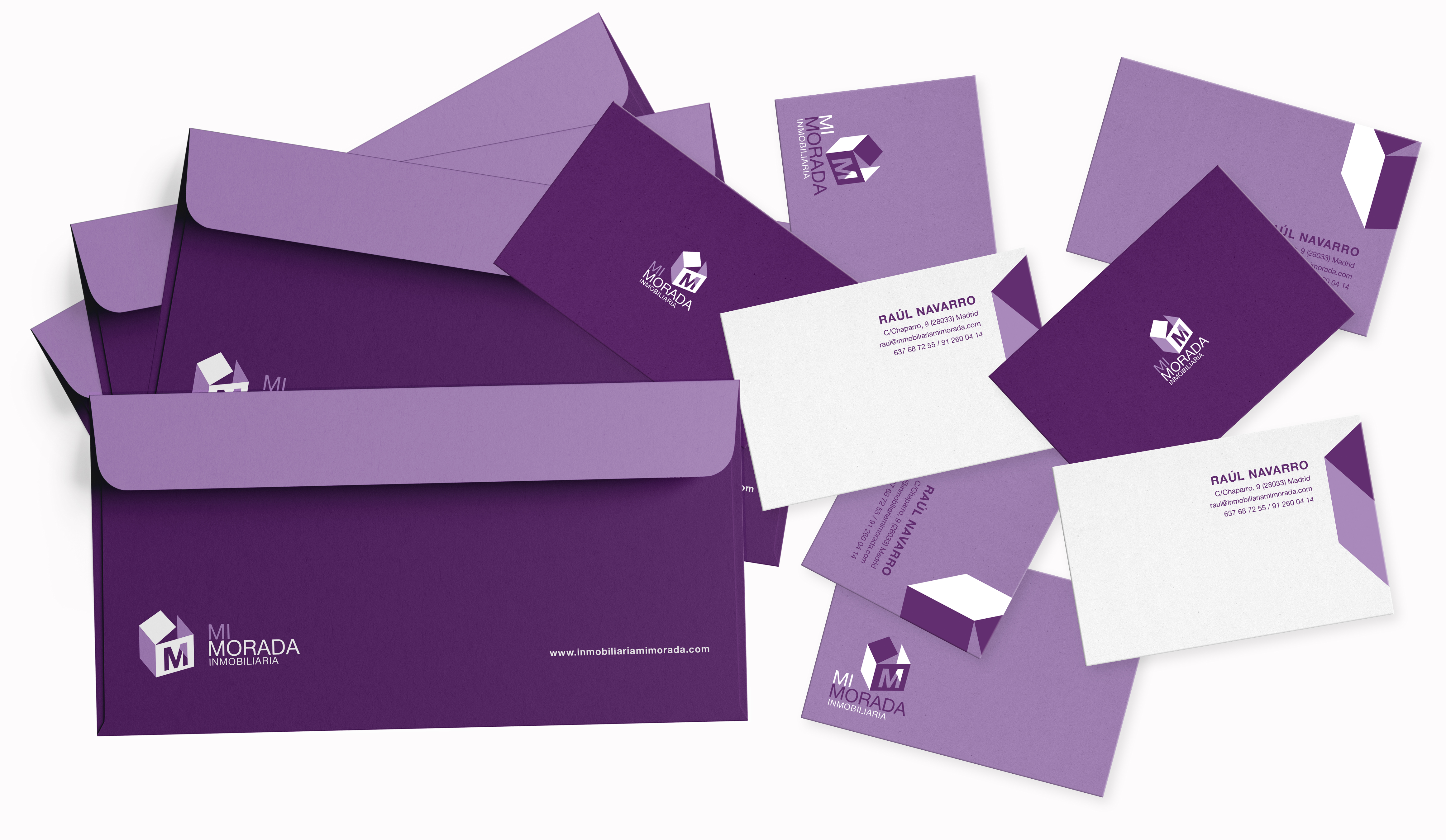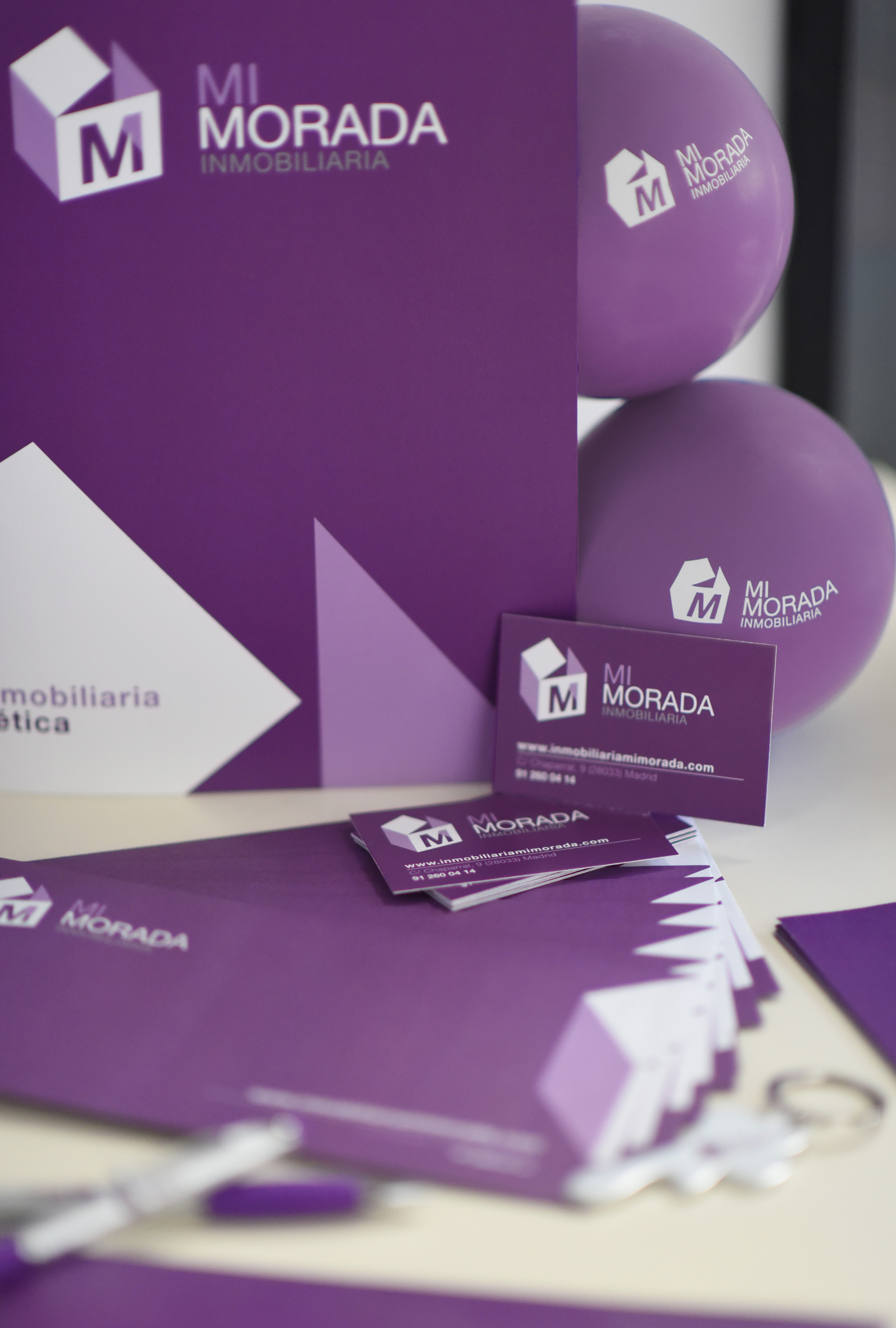 La identidad visual de Mi morada parte del logotipo basado en una caja de mudanza y continúa a lo largo de las intervenciones gráficas definidas por las diferentes necesidades de la inmobiliaria. Desde la papelería corporativa, dípticos informativos, posters o merchandising.
