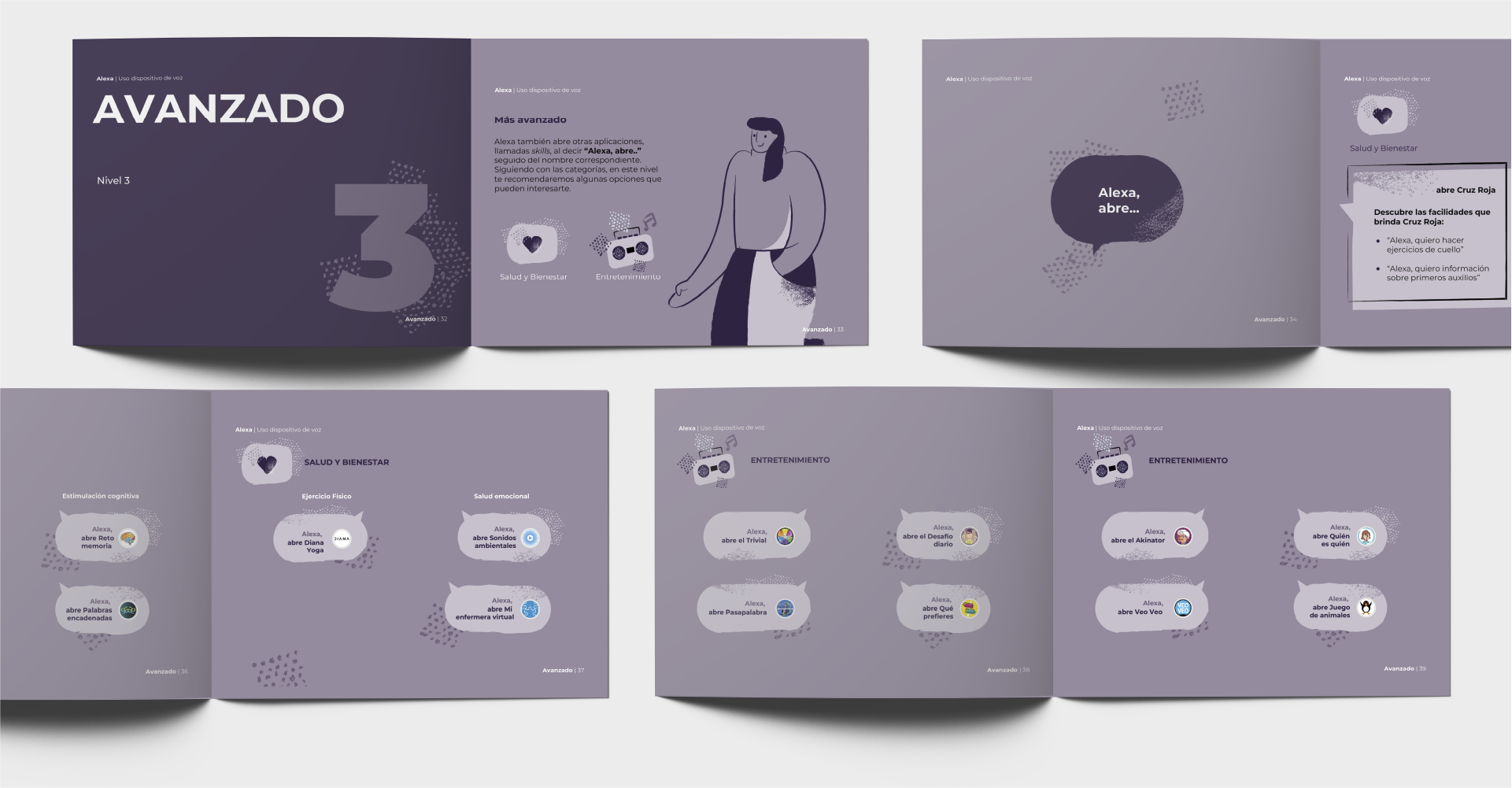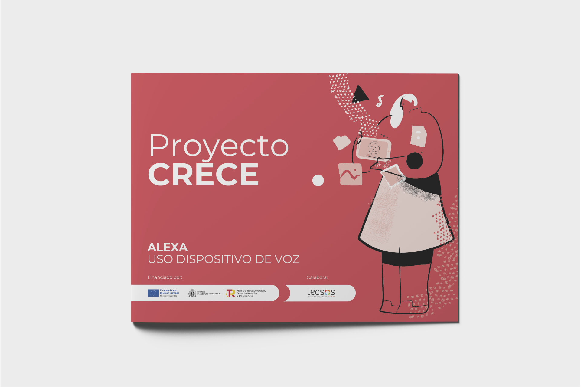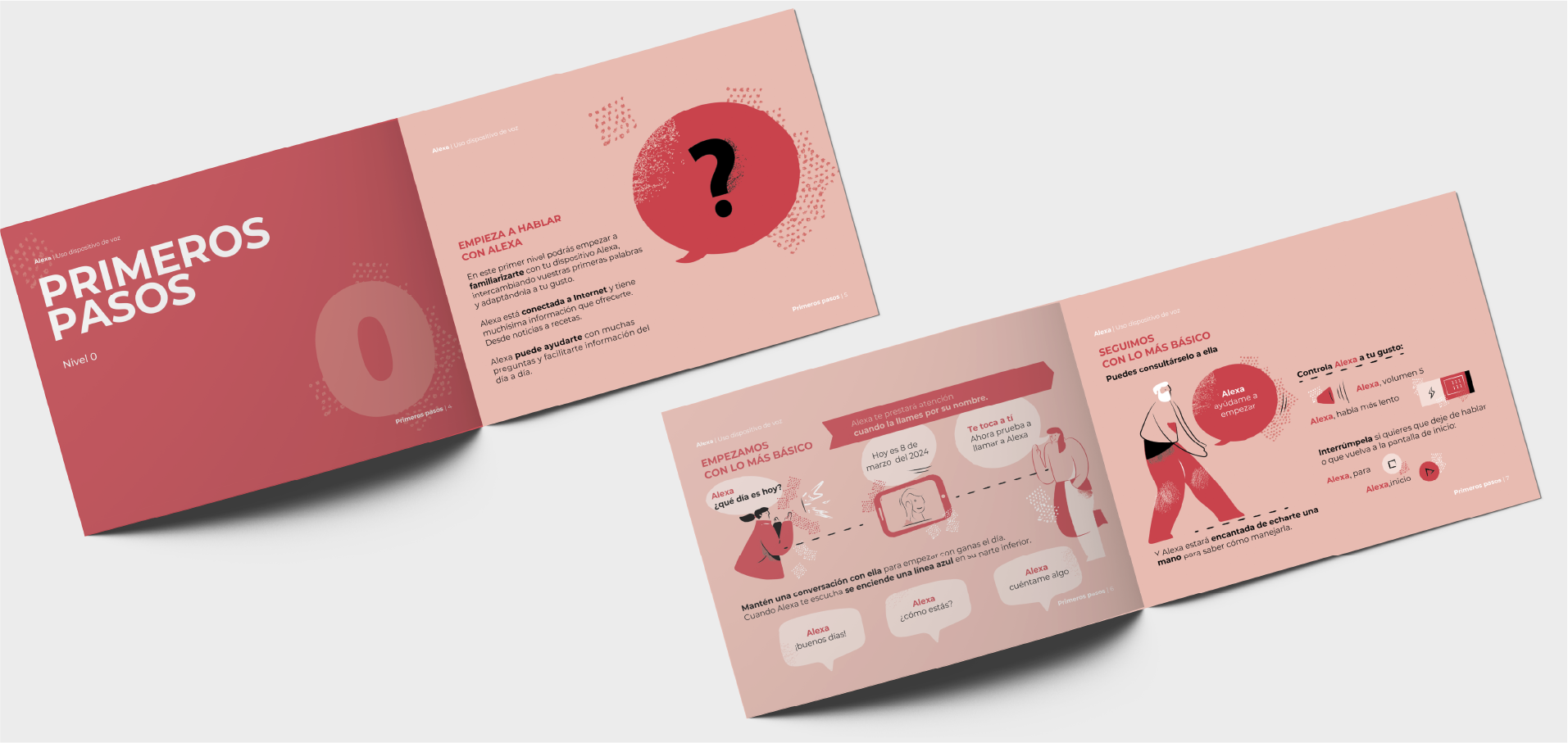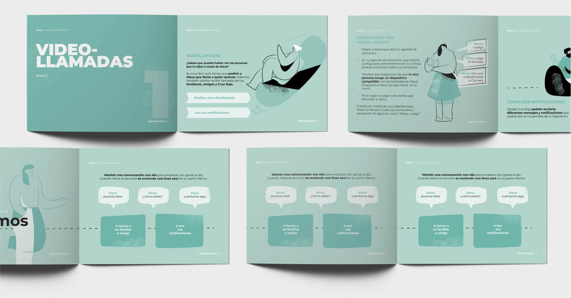 Dentro del proyecto CRECE, Cruz Roja me encargó el diseño de una guía para facilitar el uso de Alexa a personas mayores y/o dependientes, ayudándolas a familiarizarse con la tecnología de forma sencilla y progresiva. La maquetación organiza el contenido por niveles, haciendo la navegación clara e intuitiva, mientras que la identidad visual refuerza la experiencia de aprendizaje.